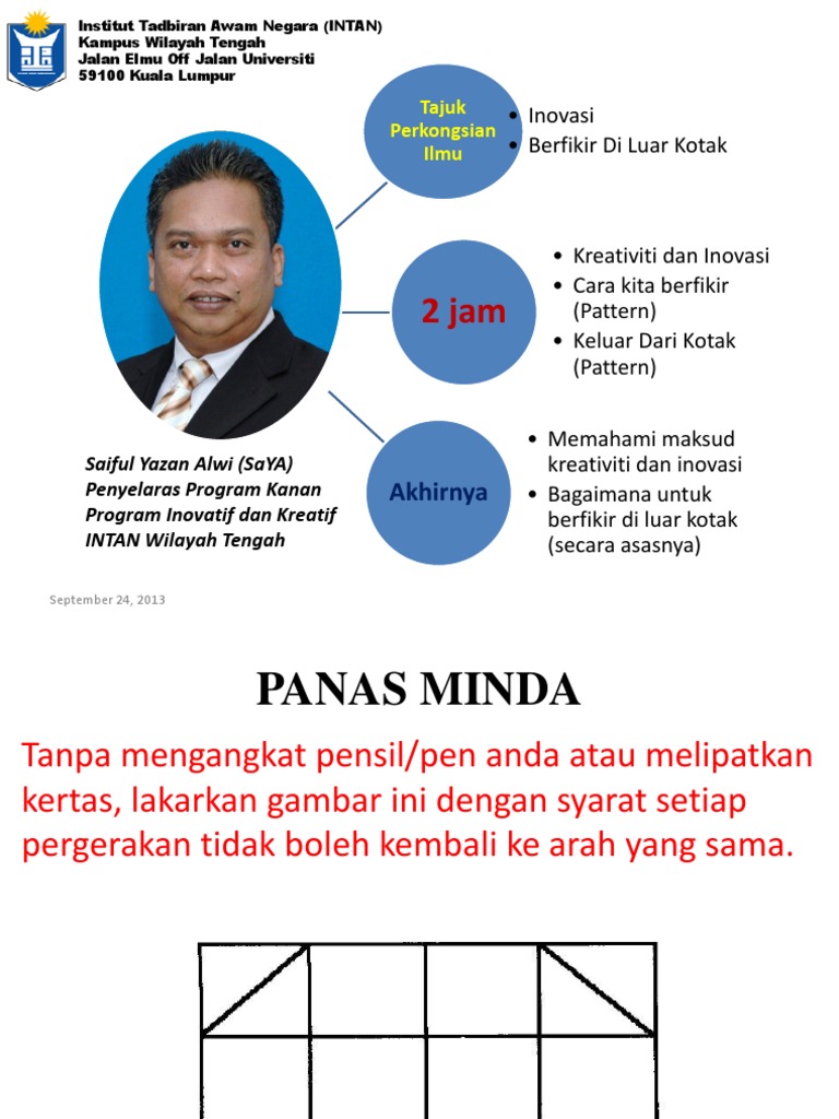 Berfikir Di Luar Kotak Perkongsian from hussenhmhuda.files.wordpress.com Kenapa orang kita susah berubah biarpun dalam hal 'jelas'? Kita mesti berani berfikir di luar kotak! Kaedah berfikir di luar kotak lebih kerap. Berfikir di luar kotak meningkatkan kualiti penyelesaian anda, kerana ia membolehkan anda mencari penyelesaian yang lebih mudah atau bahkan hanya yang baru. The eyes of the world were on singapore, not malaysia. This is a part of the segment for #kchtv which will be on air on 18th august 2012. >pasar idea (idea's market), 'produk' harus terbaik supaya terus laku. Yang dimaksud kotak dalam hal ini adalah perumpamaan pembatasan diri seseorang pada saat melihat suatu permasalahan.