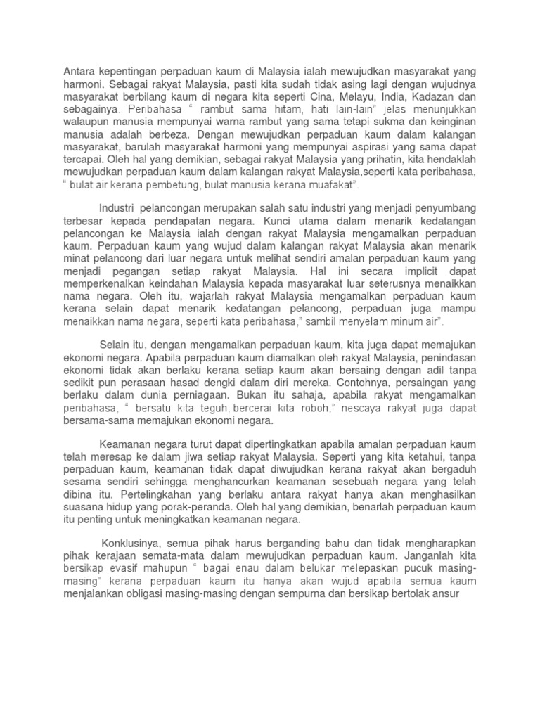 KARANGAN Cara-cara Memupuk Semangat Perpaduan Dalam ... from imgv2-2-f.scribdassets.com Perpaduan antara kaum amat penting bagi menjaga keselamatan negara. Aspek tersebut menjadi penyumbang kepada perkembangan pemakanan yang mempengaruhi perpaduan kaum di malaysia. Salah satu kepentingan perpaduan kaum adalah bagi menjamin keamanan negara. Teriakan keramat 'merdeka' pada 31 ogos 1957, tidak semudah dilalui dan memaknakan kemerdekaan tersebut. Selain mengambil insentif menjalankan kerja kumpulan antara kaum Sungai memainkan peranan yang besar dalam membekalkan makanan dan minuman kepada manusia. Jurang perbezaan ekonomi dan budaya antara kaum harus dihapuskan. Perpaduan penting dalam menjamin keharmonian negara negara malaysia keadaan ini dapat dikekalkan kerana berlakunya toleransi antara kaum utama terbesar dinegara kita iaitu melayu cina dan india.